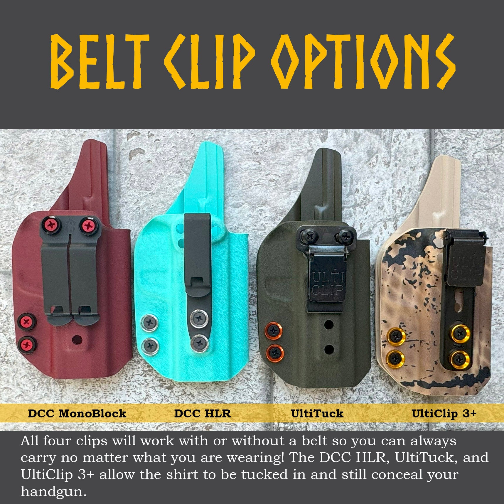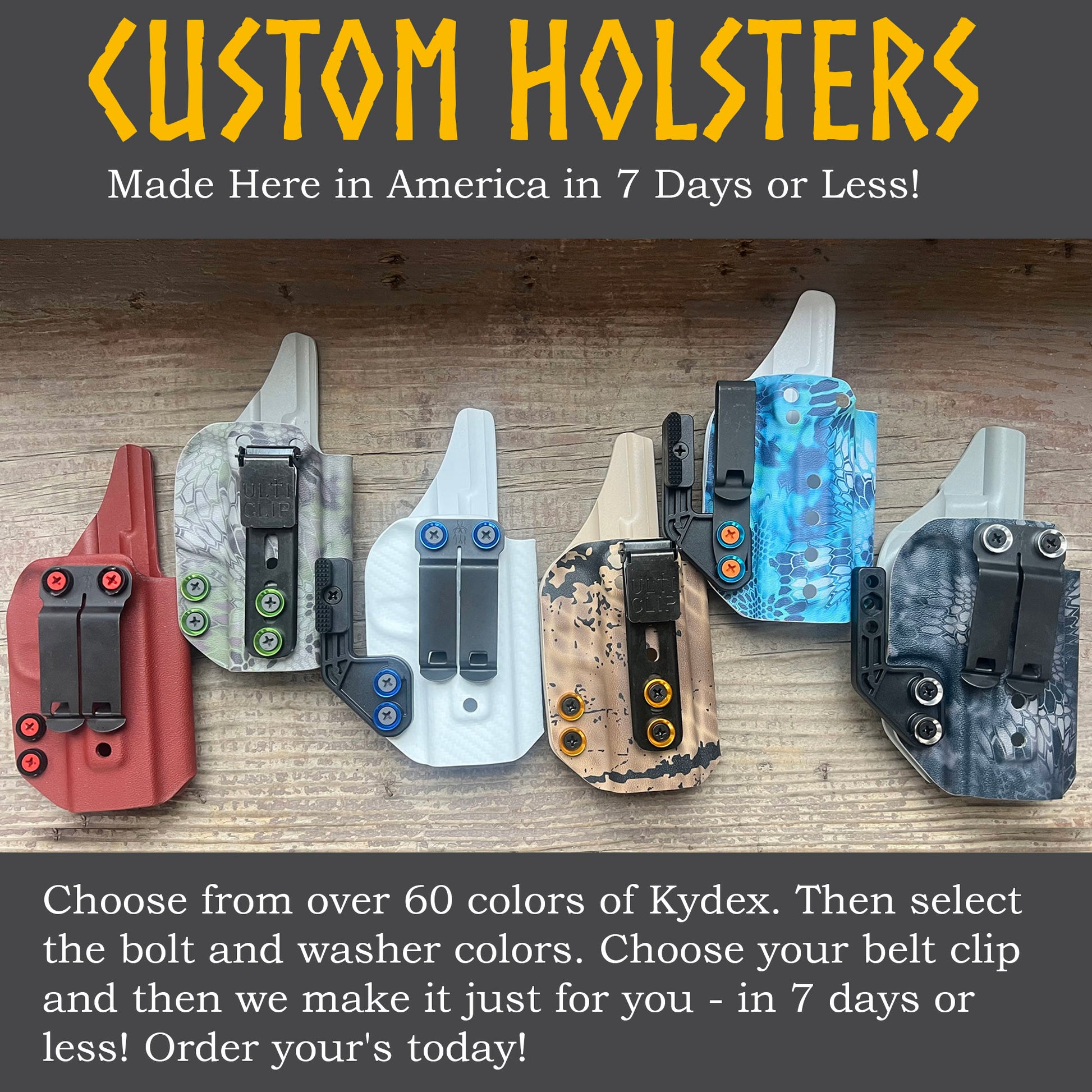 - Choose from over 60 colors of Kydex. Select from 4 different belt clips. You even get to choose the color of washers and bolts.